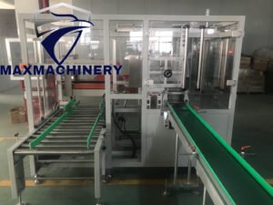 Maxmachinery series of fully automatic side-push Case packer line automatically packs boxed products. Cartons are tilted upside down from the machine, which automatically draws in and opens them. Stacked cartons are automatically pushed into horizontal cartons, and then sealed on both sides.